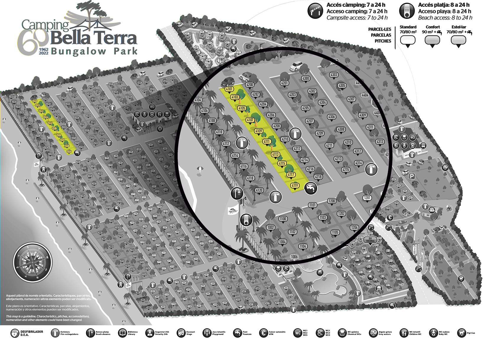 Skyggefulde pladser beliggende i en stor fyrreskov. Standardpladserne er let tilgængelige, og de er meget tæt på mange faciliteter.