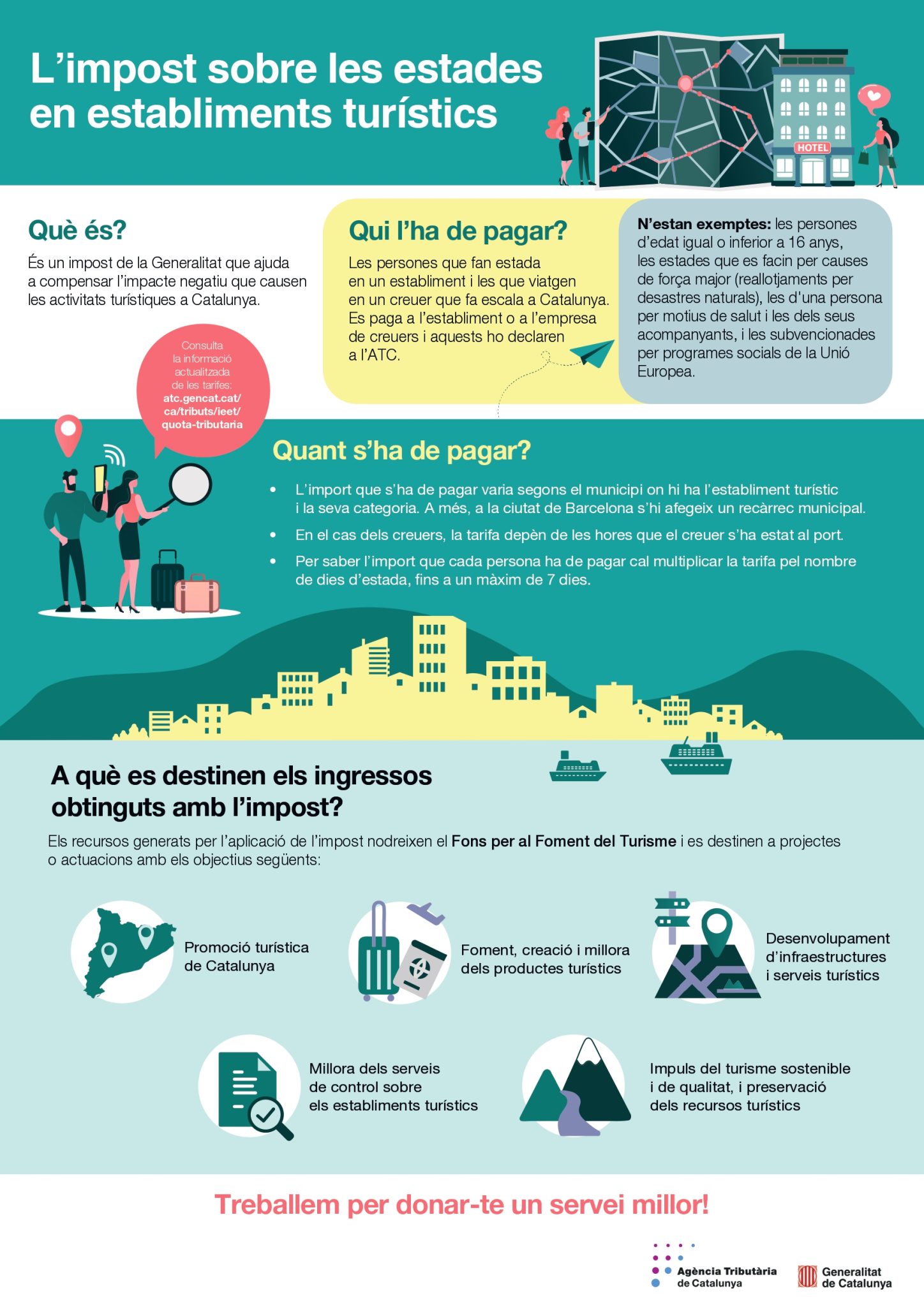 Us informem que, segons la normativa vigent de la Generalitat de Catalunya, les persones que s’allotgen en establiments turístics han d’abonar l’Impost sobre les Estades en Establiments Turístics (IEET). Aquest impost s’aplica a allotjaments com càmpings, hotels, apartaments turístics, albergs de joventut o creuers, entre d’altres.
